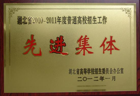 3月1日上午,湖北省2012年招生工作会议在武汉召开,会议总结了我省2011年度招生工作,部署了2012年度招生工作。会上,我校被授予“湖北省2010—2011年度普通高校招生工作先进集体”荣誉称号。这是继我校被评为 “湖北省2007——2009年度普通高校招生工作先进集体”后,再一次获此荣誉。
